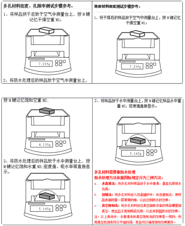 秒準科(kē)儀标準規範(fàn):根據ASTMD854-02、C359、JIS、GB/T24528、6155、24203、YBT63、ISO等标準(zhǔn)。采用阿基米(mǐ)德浮👨❤️👨力法⭐,應(yīng)用真空飽和(hé)法、煮沸飽和(hé)法、浸漬法的(de)操作、快速⛱️讀(dú)取量測數值(zhi)。