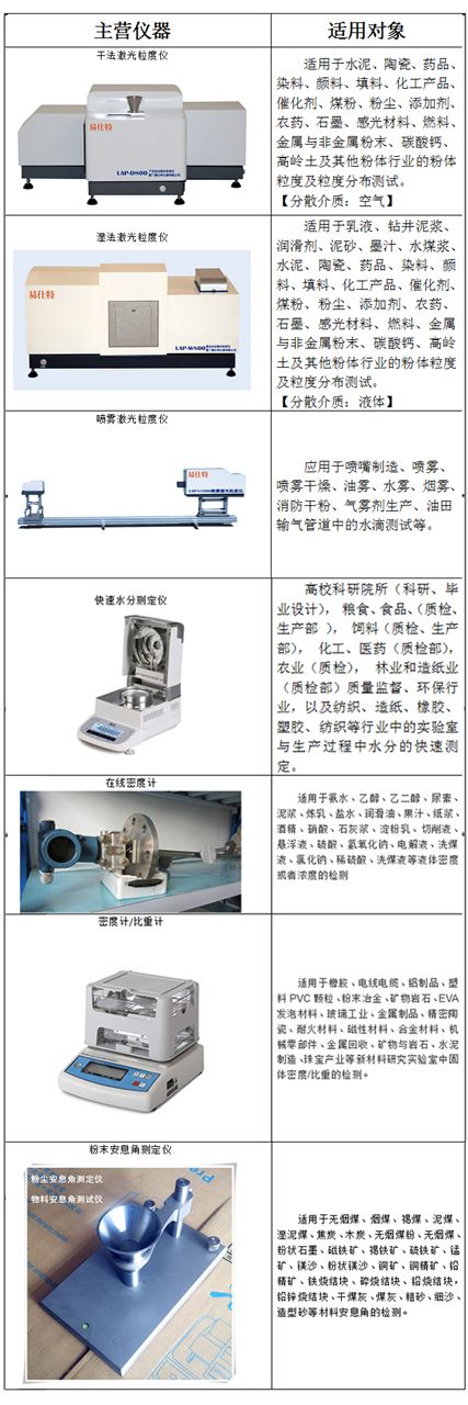 廈(sha)門易仕特儀器(qì)有限公司座落(luo)于風景秀麗的(de)經濟特區—廈門(men),易仕特緻力于(yu)各種快速分析(xī)檢測技術的創(chuàng)新和應用,是集(ji)研發、制造、銷售(shou)和服務爲一體(tǐ)的綜合性高新(xin)技術企業。易仕(shì)特堅守“E-、A-*、S-标準、T-可信”的東方(fāng)儀器制造精神(shen),爲客戶提(ti)供的測試方案(àn)和高品質産品(pin)。易仕特主🙇♀️營産(chǎn)👌品包括幹法激(ji)光粒度儀,濕法(fǎ)激光粒度儀,幹(gàn)濕一體激光粒(lì)度儀,噴霧激光(guang)粒度儀,圖像粒(li)度分析儀,固體(ti)密度計,液體密(mi)度計,在線密度(dù)計,快速水分測(cè)試儀,粉🈲末測試(shì)儀器等等檢測(ce)設備。以下是易(yi)仕特主營産品(pin)适用範圍。
